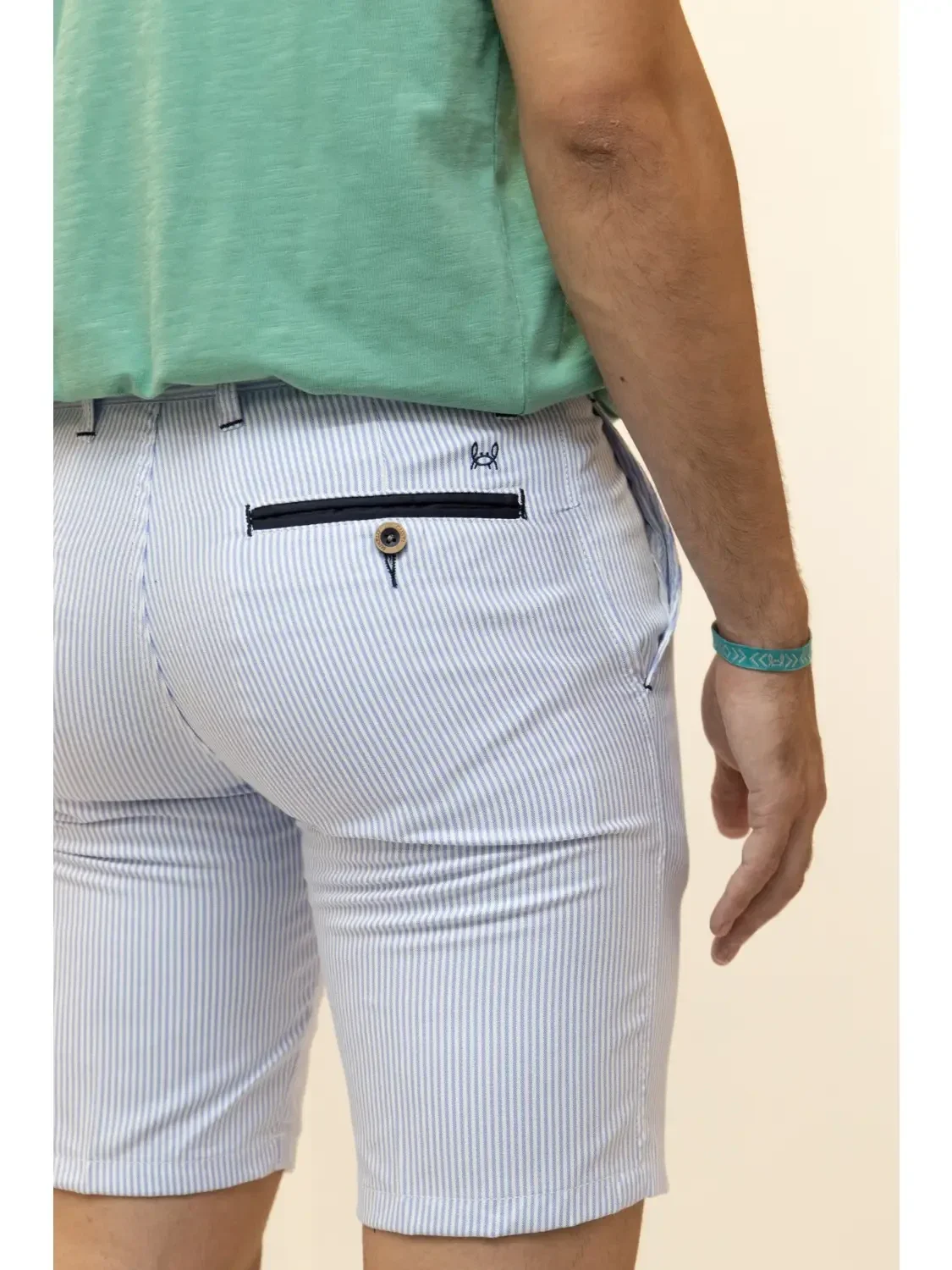 • Korte broek met normale pasvorm en lichtblauwe strepen. Gemaakt van 100% katoen, elastische stof, ritssluiting en knoopsluiting en heeft voor- en achterzakken