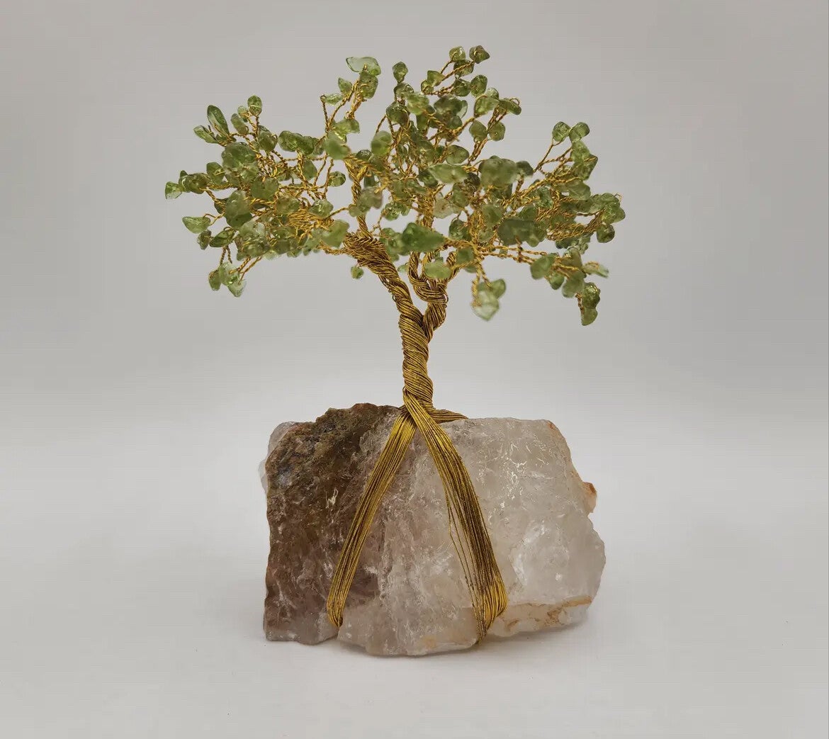 Breng balans, bescherming en positieve energie in huis met deze handgemaakte edelsteenboom. De bladeren zijn gemaakt van peridoot, de basis van rookkwarts, en alles is met gouddraad zorgvuldig gevormd tot een prachtig kunstwerk.