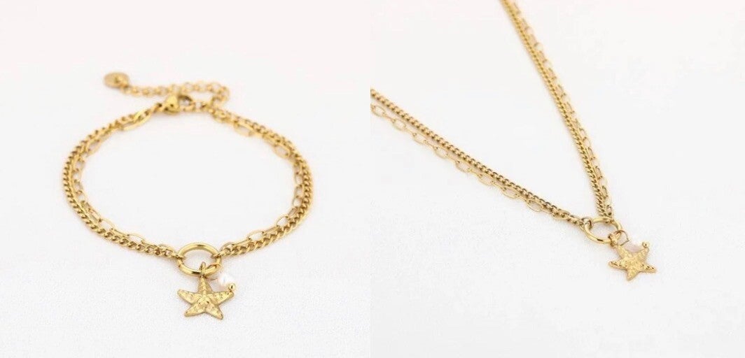 Deze set bestaat uit onze bracelet golden star (€15,95) en onze necklace golden star (€19,95) samen ter waarde van €35,90 nu verkrijgbaar voor €29,95.